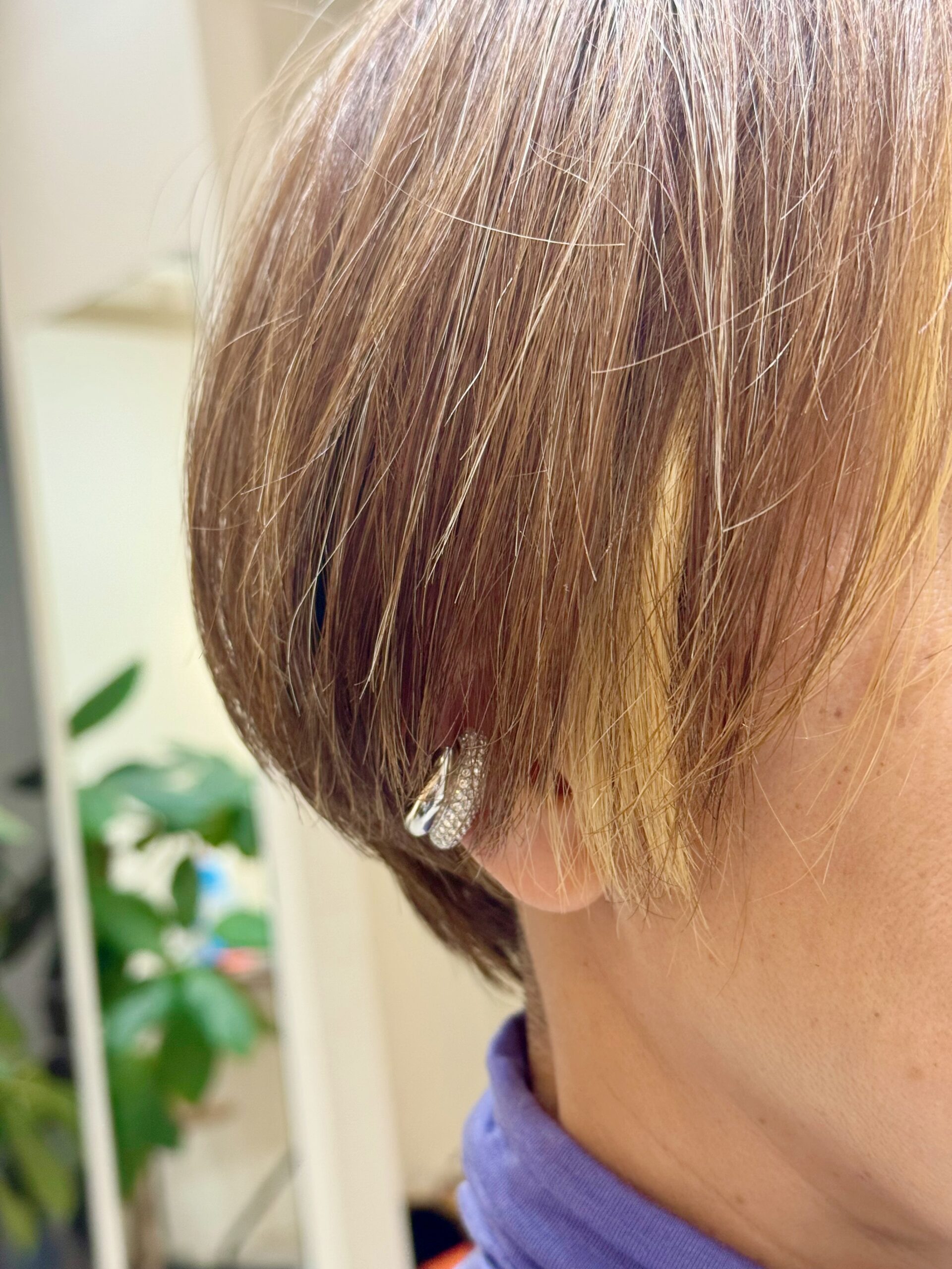 全体的には白髪染めは一切使わず毛染めの明るめで染めた所にフェイスラインと耳周りにブリーチを使い明るくしたフェイスフレイミングとインナーカラーを忍ばせました