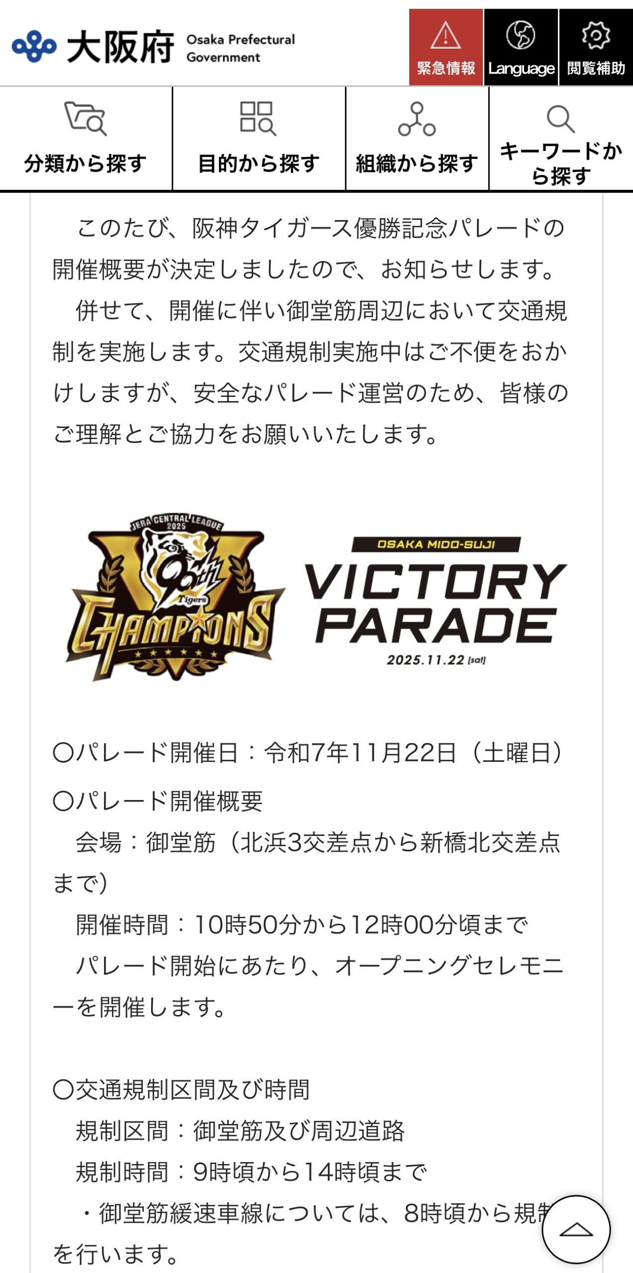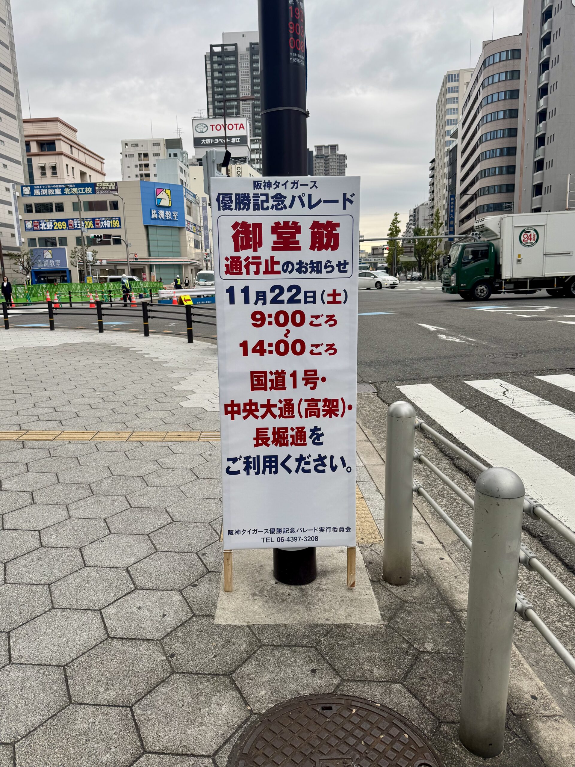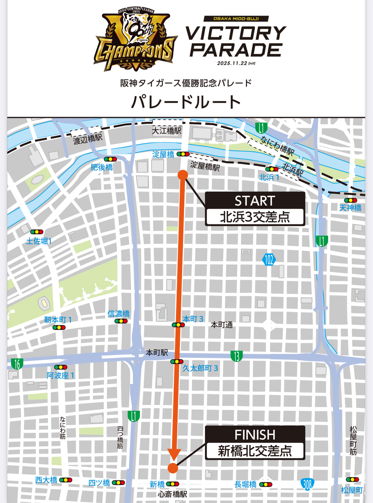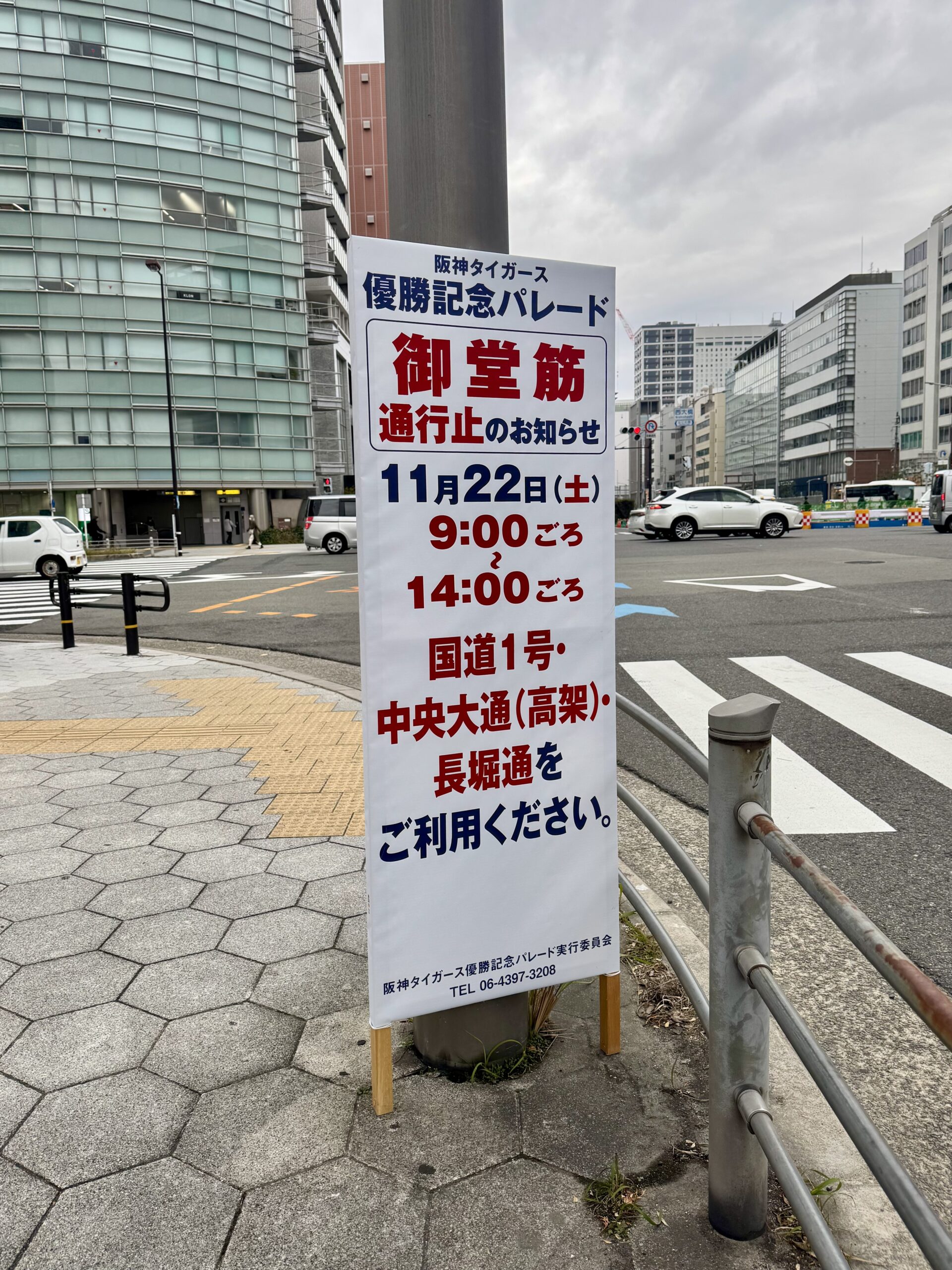 2025年11月22日 土曜日 阪神タイガース2年ぶり7度目 日本野球史上最速のリーグ優勝の為 大阪のメインストリート御堂筋で優勝パレードが行われます それに伴い交通規制も実施されますのでお気を付け下さい