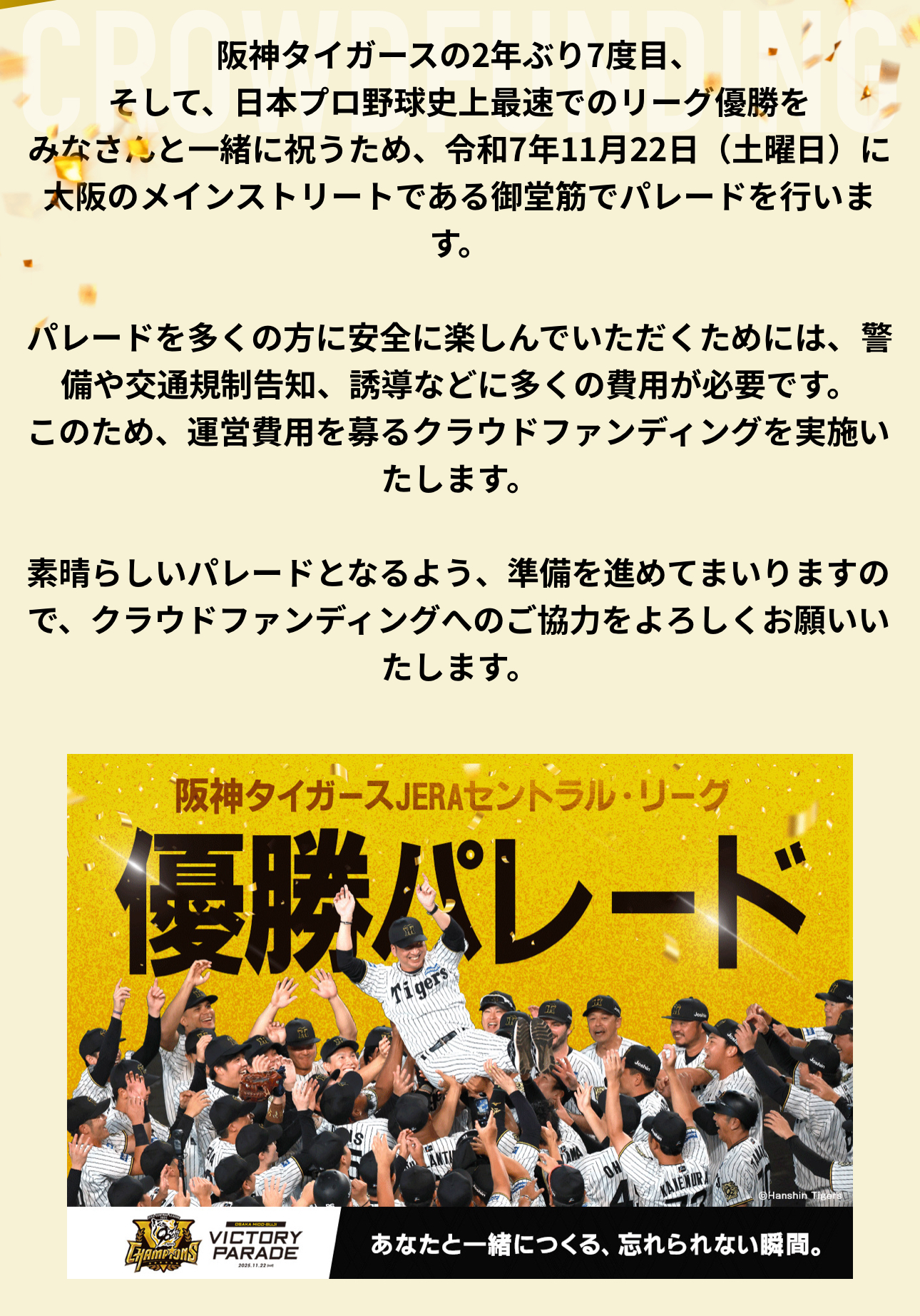 阪神タイガースの2年ぶり7度目、そして、日本プロ野球史上最速でのリーグ優勝をみなさんと一緒に祝うため、和7年11月22日(土曜日)に大阪のメインストリートである御堂筋でパレードを行います だって