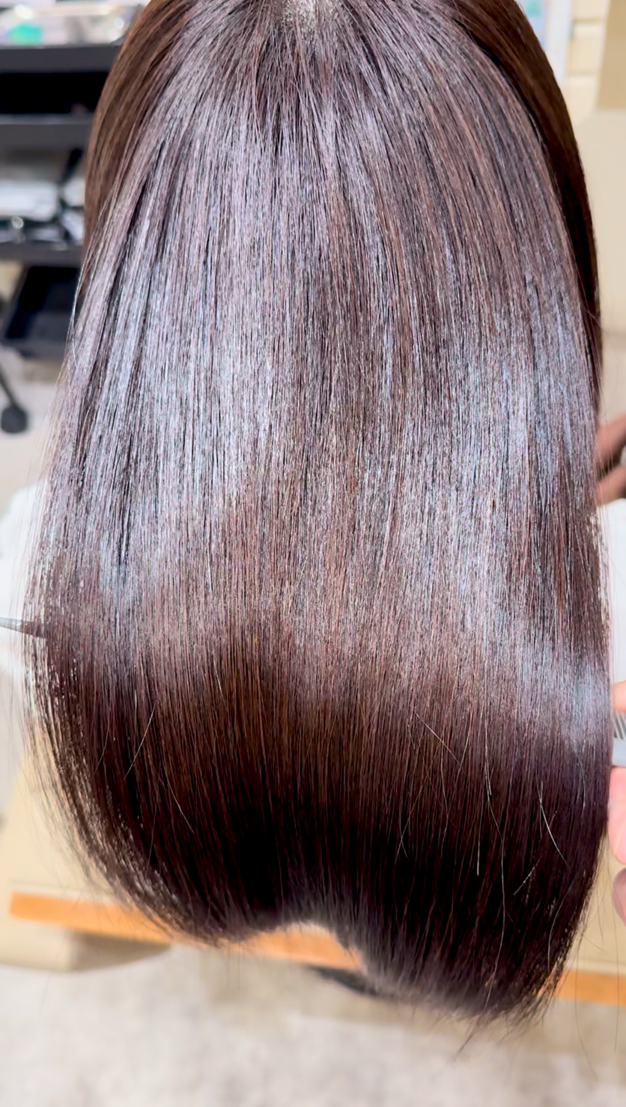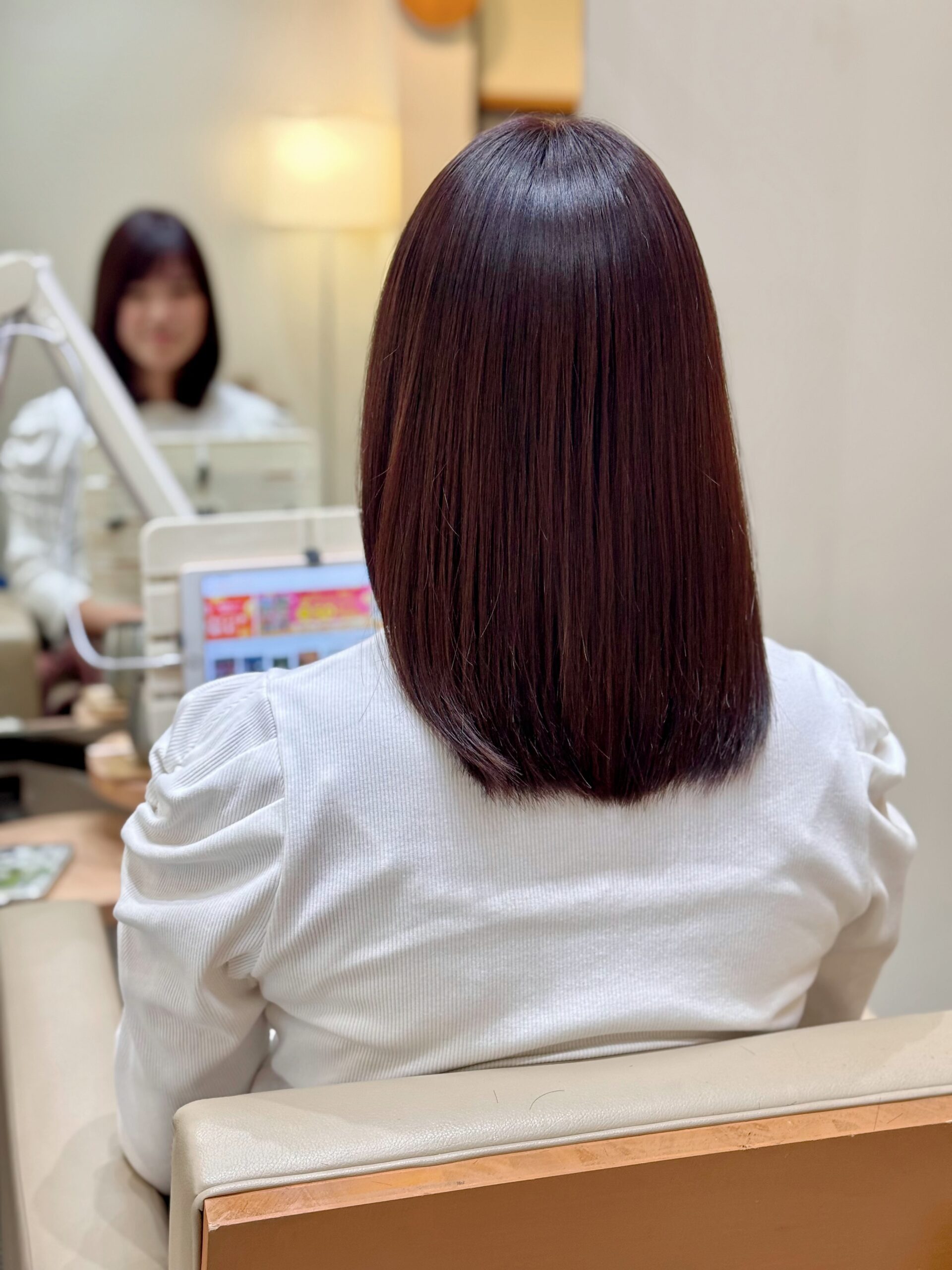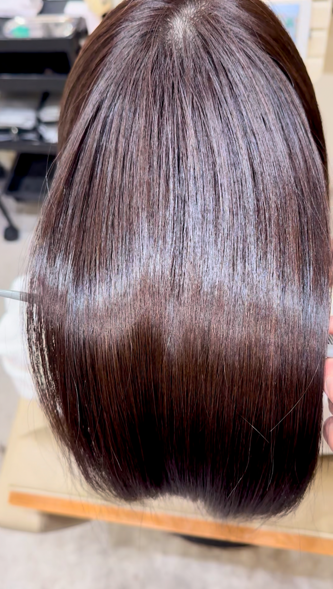 秋冬を意識した深みのあるヘアカラーとも相まって髪の中から潤いが溢ればかりなみずみずしさでスベスベ感が半端ない
