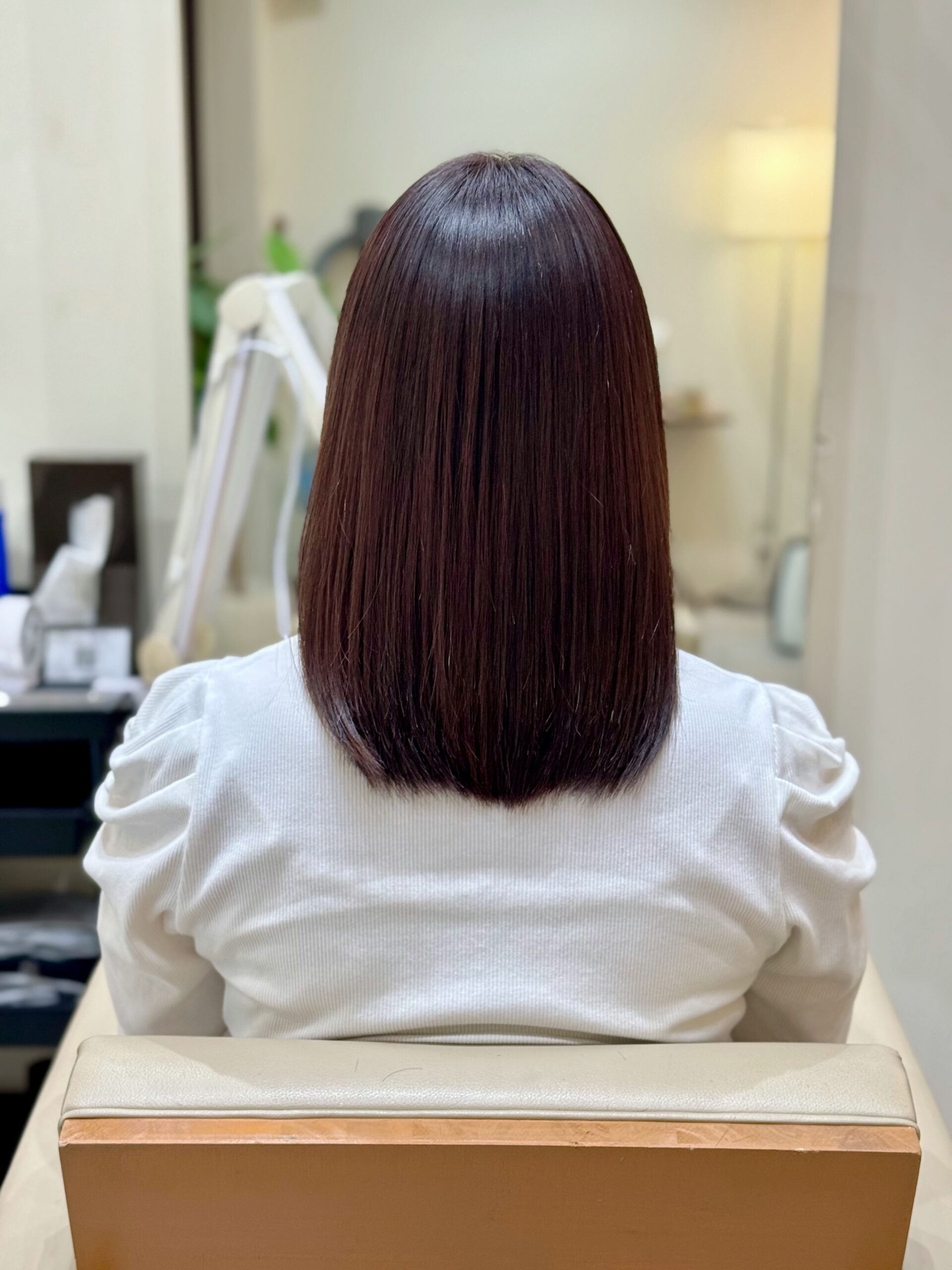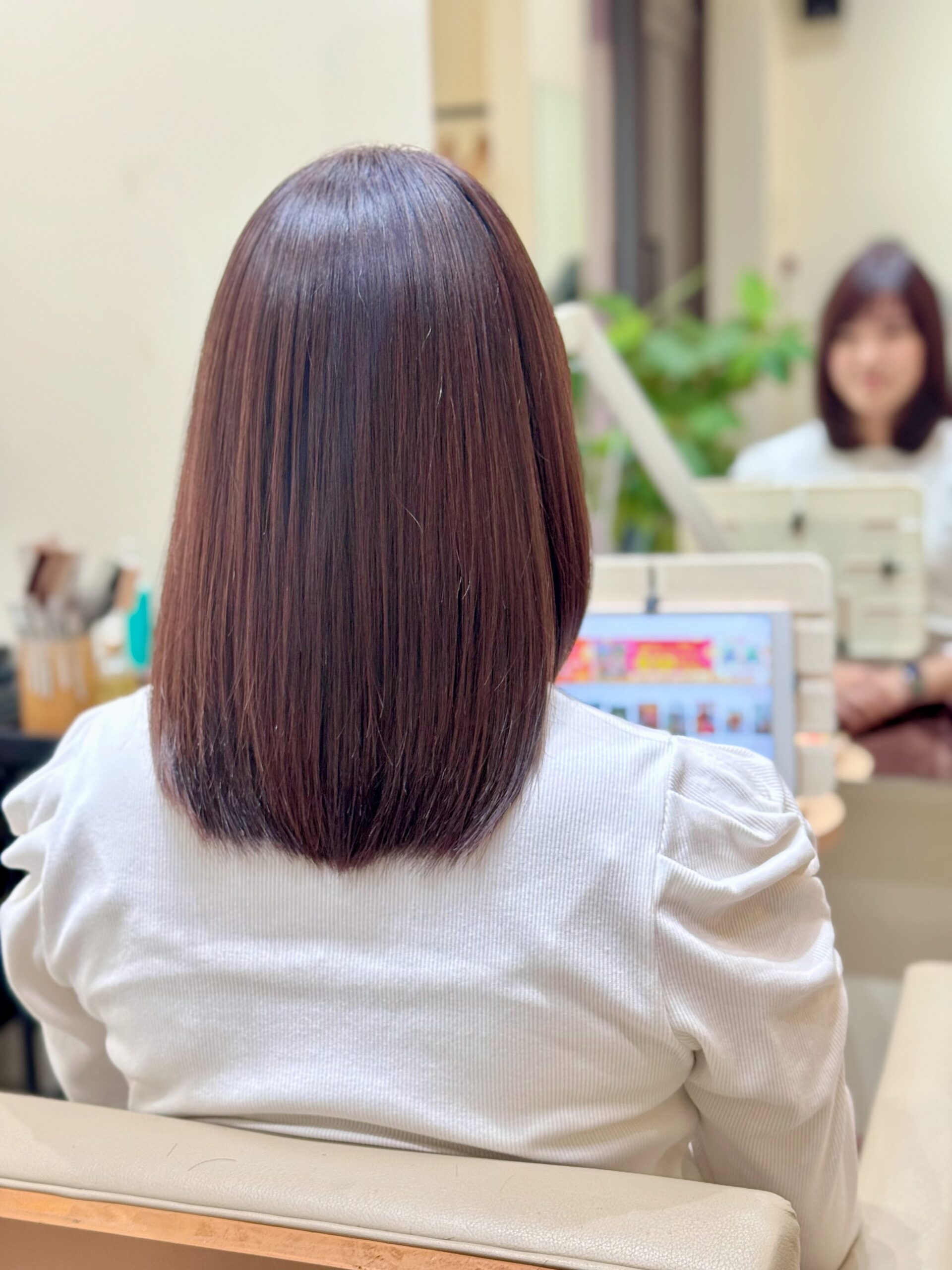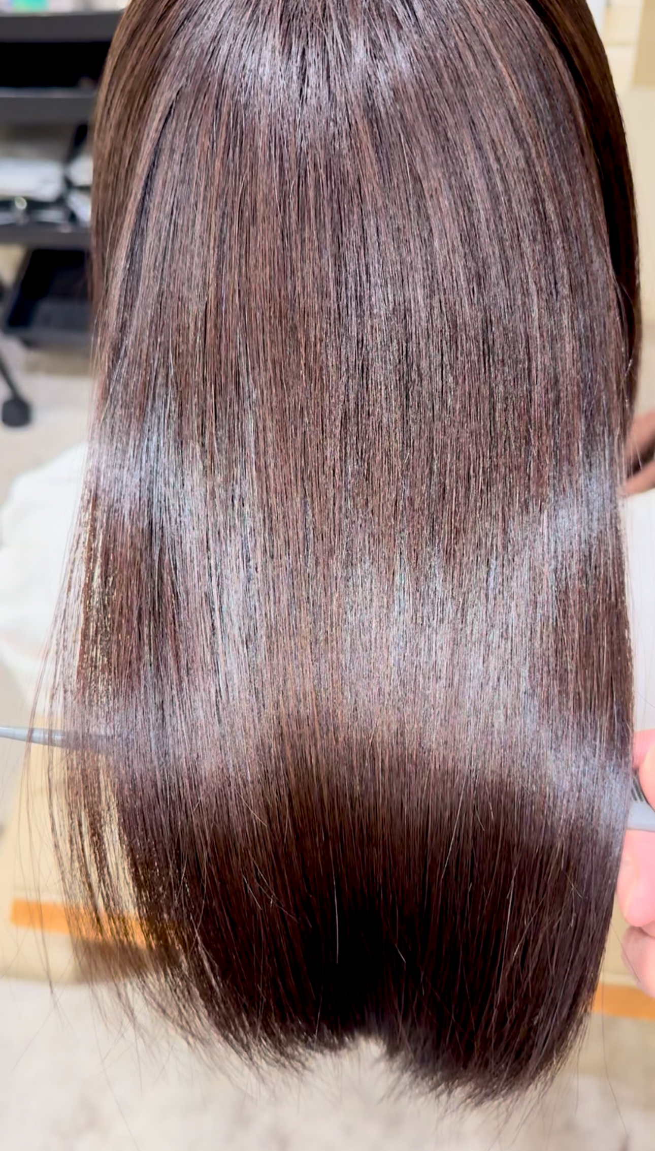 秋冬を意識した深みのあるヘアカラーとも相まって髪の中から潤いが溢ればかりなみずみずしさでスベスベ感が半端ない