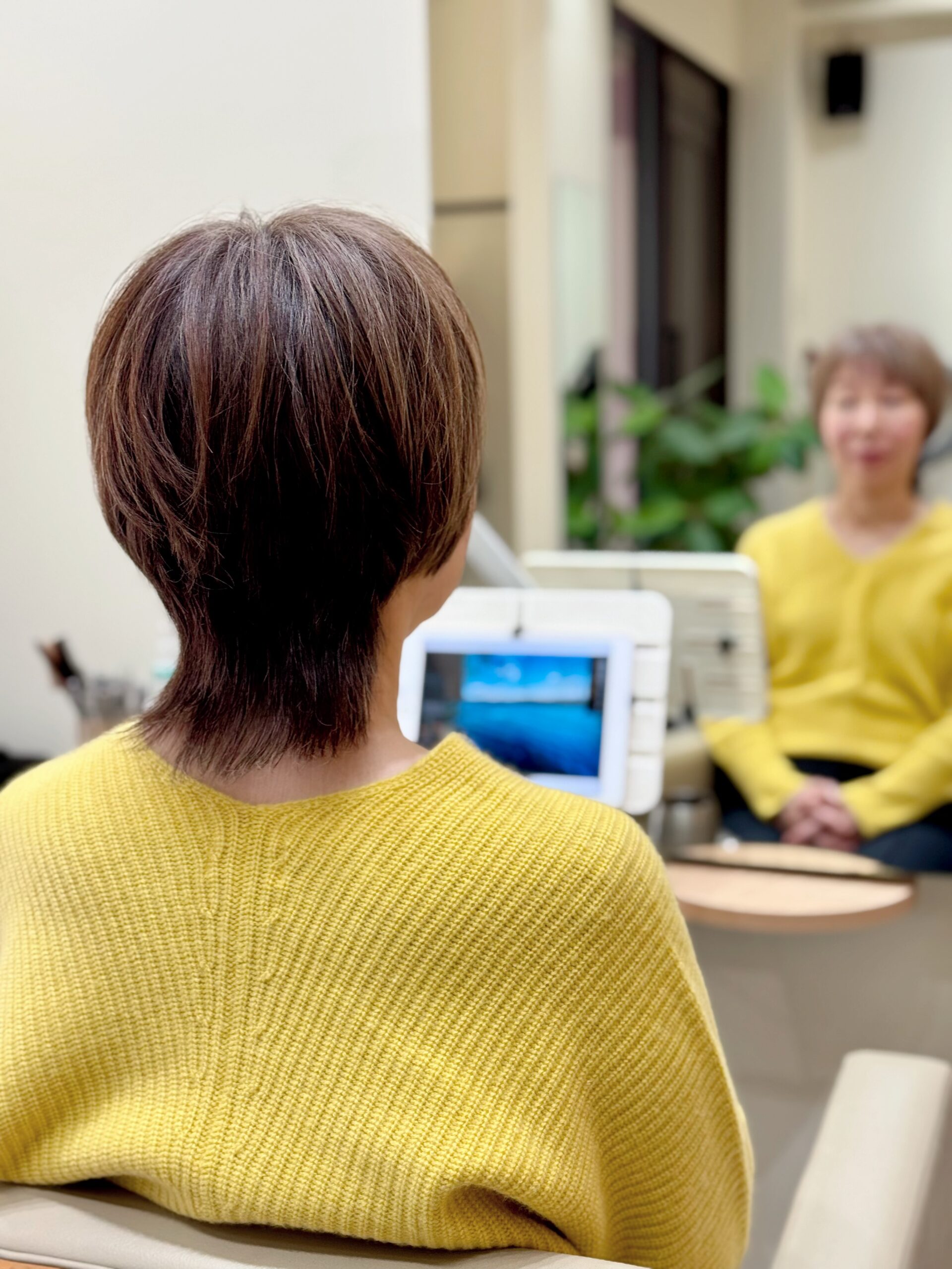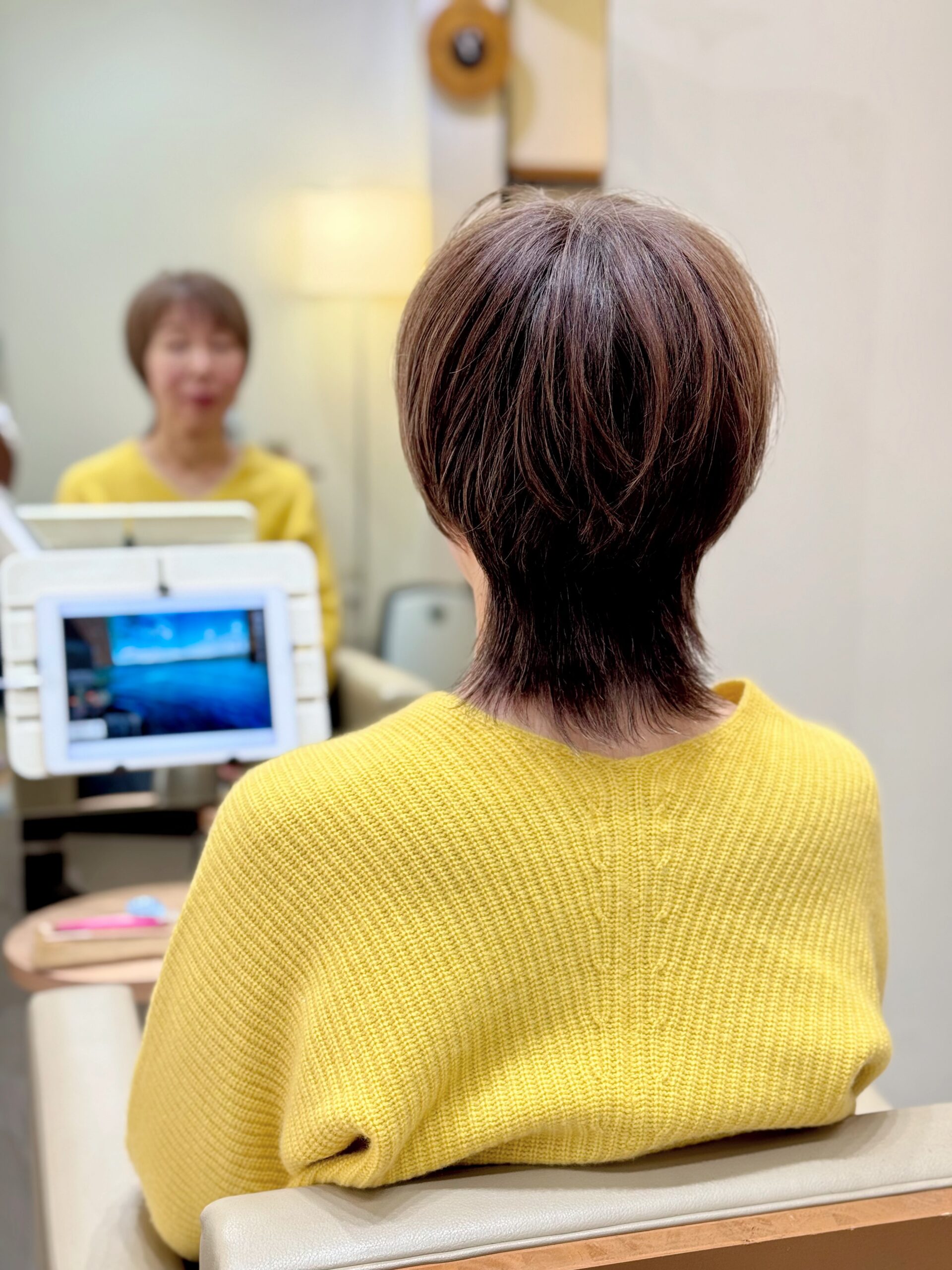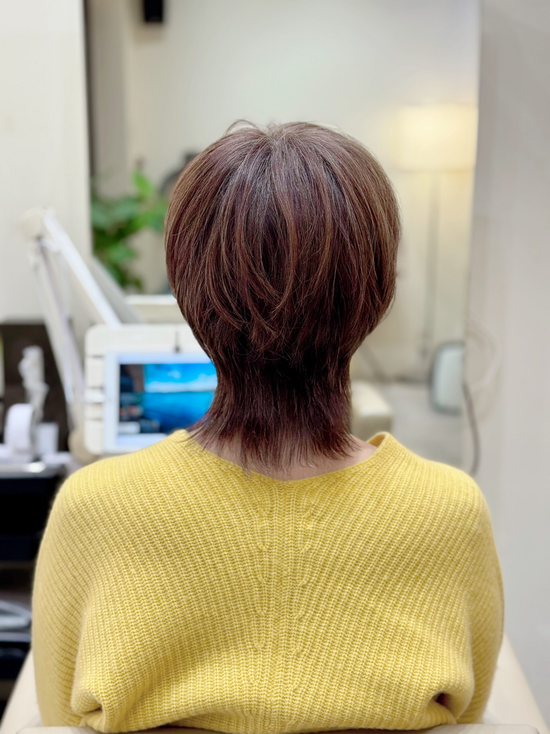後は大人女子あるあるな白髪問題も解消させてもらうんだけど頭皮が敏感で沁みるタイプのアツコさんだから そこは考慮して少し甘めに塗らせてもらって頭皮トラブルを回避させてもらっている