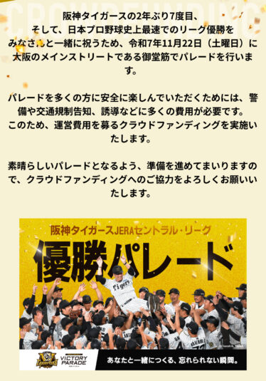2025年11月22日 土曜日 阪神タイガース2年ぶり7度目 日本野球史上最速のリーグ優勝の為 大阪のメインストリート御堂筋で優勝パレードが行われます それに伴い交通規制も実施されますのでお気を付け下さい
