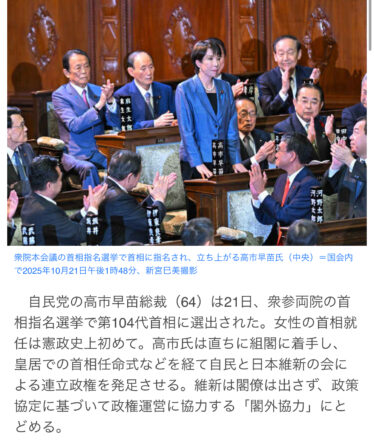 高市早苗氏が日本で女性初 第104代首相に就任されました